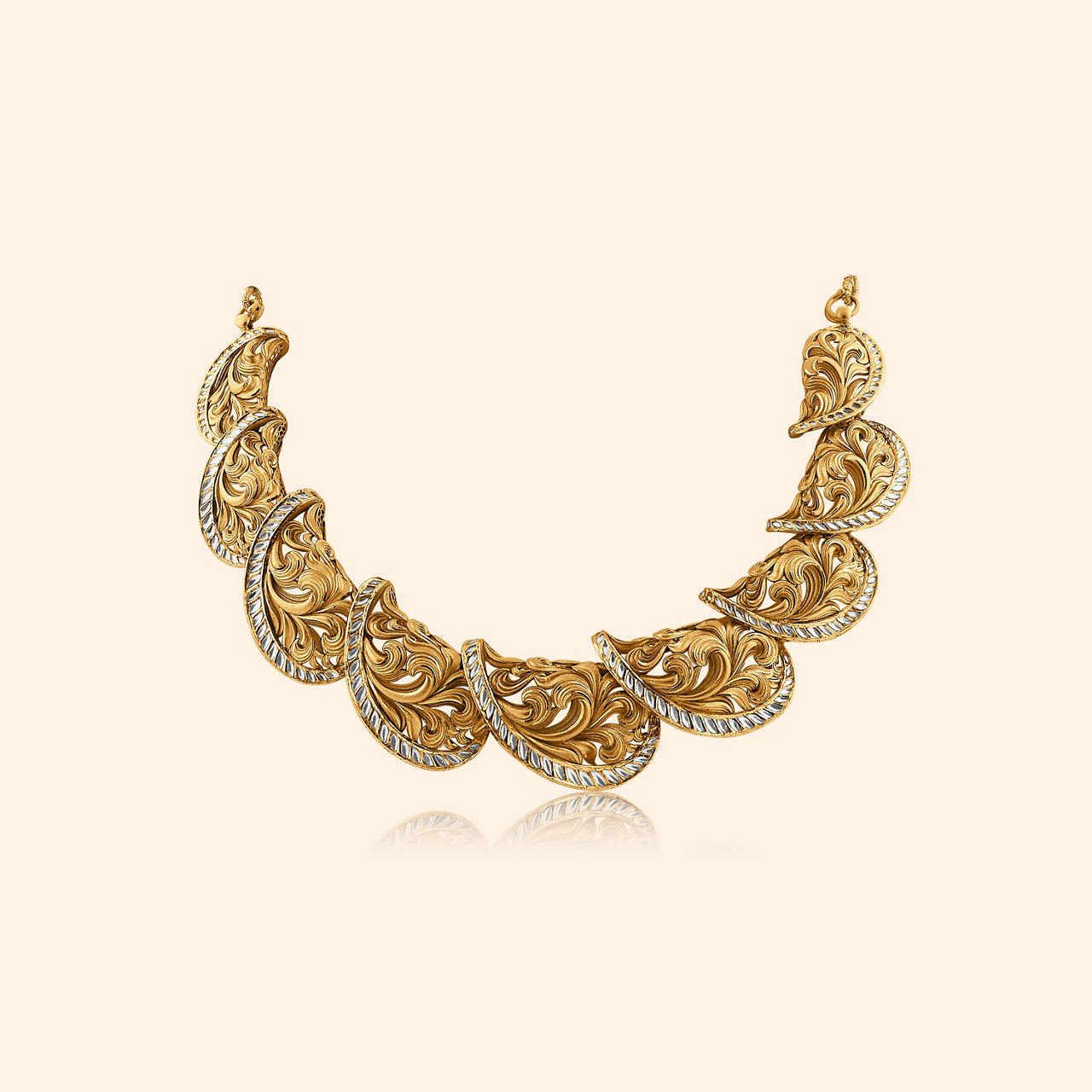 An ode to regal artistry, these 22 karat yellow gold stud earrings embody ethno-contemporary finesse. The intricate foliage design is enriched with radiant kundan stones, their brilliance heightened by the antique finish. Designed for heavy occasion wear, these studs offer a timeless charm while exuding opulence and grace. Their exquisite detailing and sophisticated appeal make them a striking addition to your jewellery collection. A statement of heritage and refinement, perfect for elevating your most treasured ensembles.