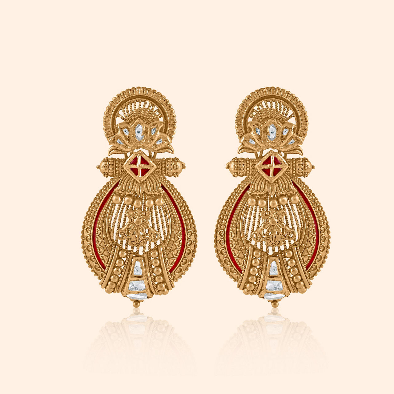 Where heritage blooms and love finds its gold, a tale of eternal union, beautifully told. Crafted in radiant 22KT yellow gold, this bridal necklace unveils a design of elevated tradition, brought to life with a distinctive antique finish. Its ornate form marries the timeless grace of floral motifs with harmonious patterns, accented by rich red enamel and luminous facets that catch the light. Designed for the most significant day, this statement piece perfectly complements a resplendent heavy silk saree or a regal lehenga. Adorn yourself with this masterpiece, a symbol of auspicious beginnings and a cherished heirloom for your new journey.