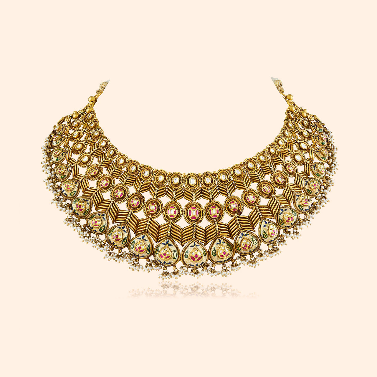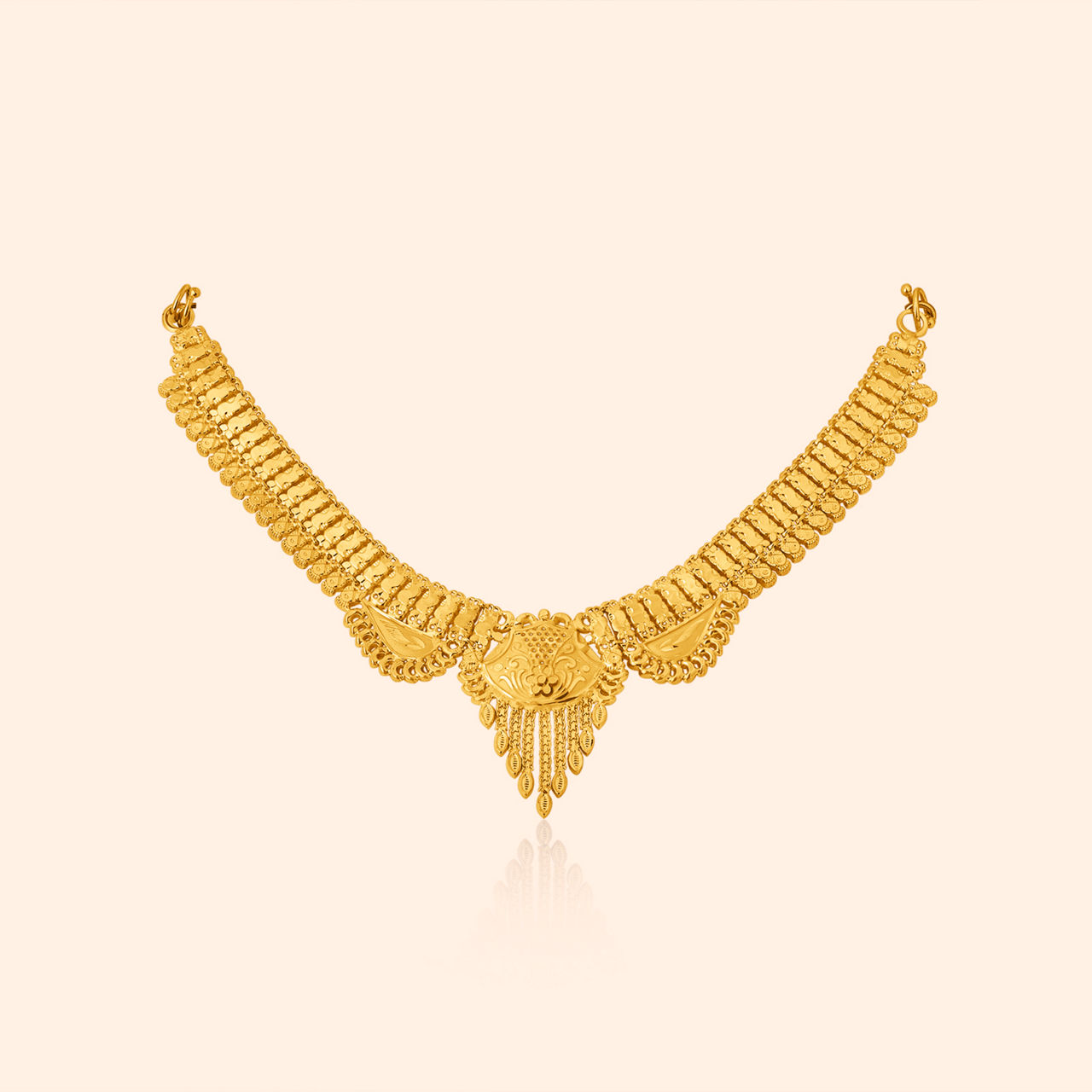 A refined expression of symmetry and heritage artistry defines this elegant short necklace. Crafted in 18KT yellow gold with a smooth yellow finish, the design features graceful geometric detailing that reflects timeless traditional craftsmanship. The Tilvara Gold Necklace is created for bridal occasions, adding a radiant golden charm that beautifully complements wedding ensembles with classic sophistication.