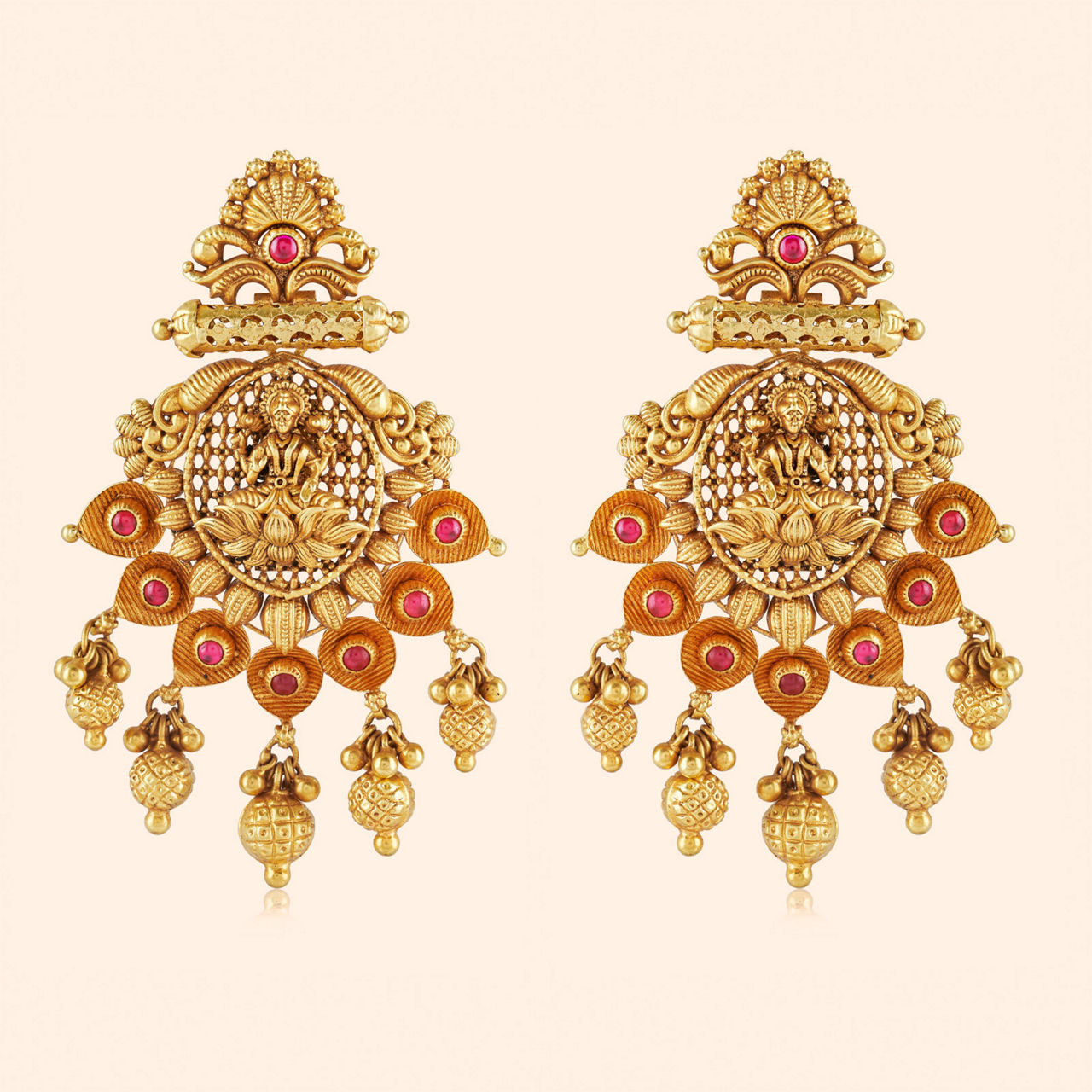 Auspicious coins cascade in a line serene, leading to a grand pendant where a goddess motif is seen, fit for a royal queen. The grand gold haar is a majestic statement piece embodying divine blessings and traditional grandeur. The long chain is composed of intricately linked elements, featuring auspicious coin motifs accented with vibrant red stones, creating a rhythmic pattern. It culminates in an exceptionally large and ornate central pendant, depicting Goddess Lakshmi, showcasing masterful craftsmanship. Numerous golden droplets dangle below, adding to its opulence. This necklace is crafted in rich 22 karat gold.