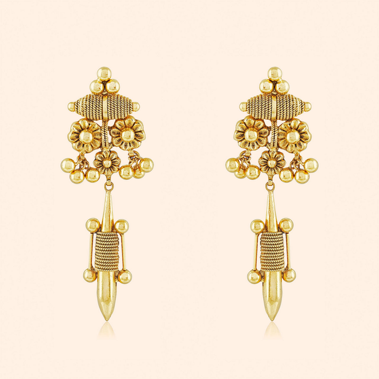 Primal power captured close around the neck resides within this space, tribal echoes time cannot erase, worn with strength and prideful grace. Make a bold statement with this gold necklace. Featuring a commanding collar design from which hang numerous pointed, bud-like elements detailed with meticulous wire wrapping. A powerful piece crafted in 22 karat yellow gold.