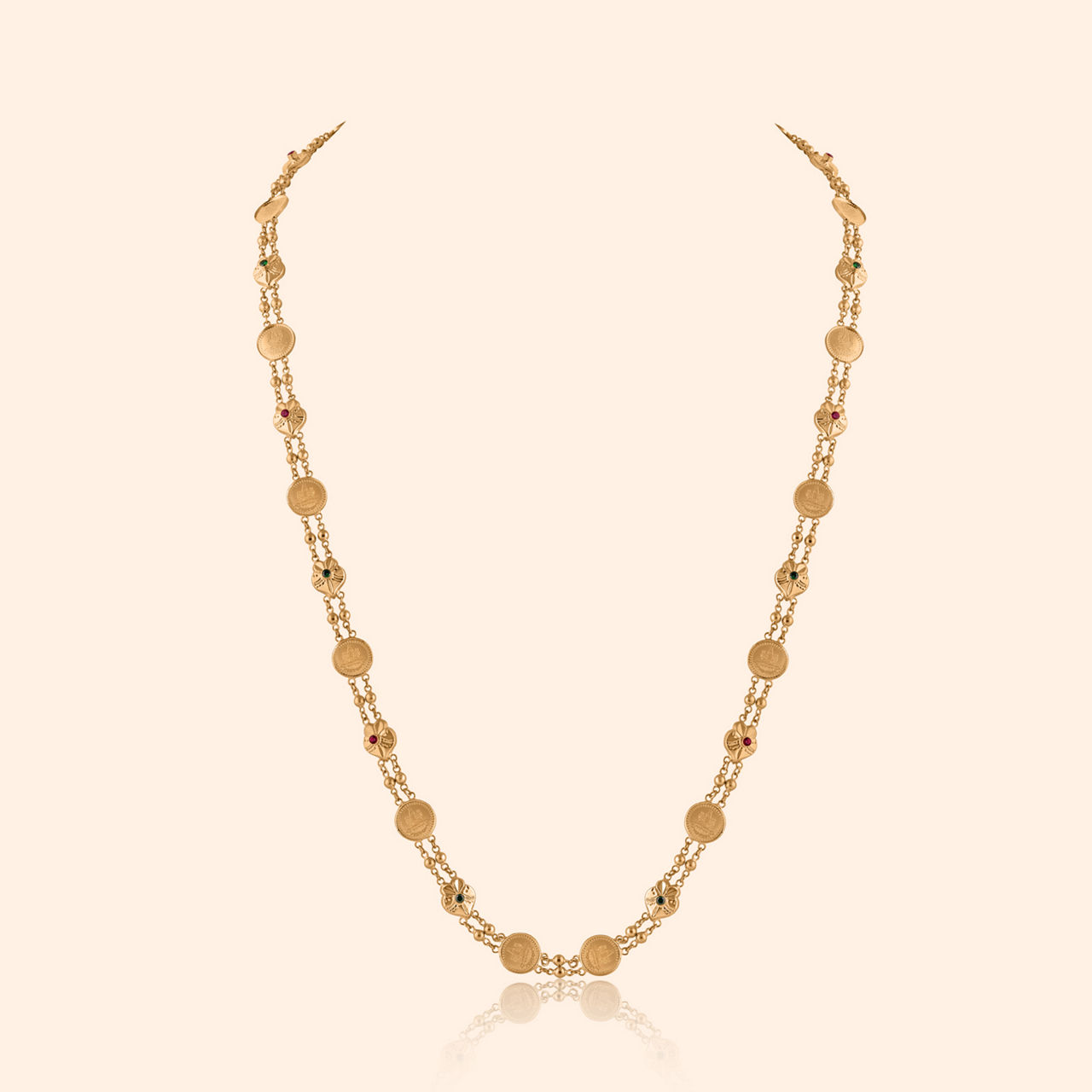 Designed in 22KT yellow gold, this elegant long necklace draws inspiration from traditional Lakshmi coin motifs, long associated with prosperity, grace, and auspicious blessings. The rhythmic arrangement of the coins creates a graceful flow that reflects the richness of heritage jewellery while remaining suitable for everyday wear. The Vardhita Gold Long Necklace is enhanced with a refined high and matte polish, allowing the intricate detailing to catch light beautifully, adding a timeless touch of cultural elegance to any look.