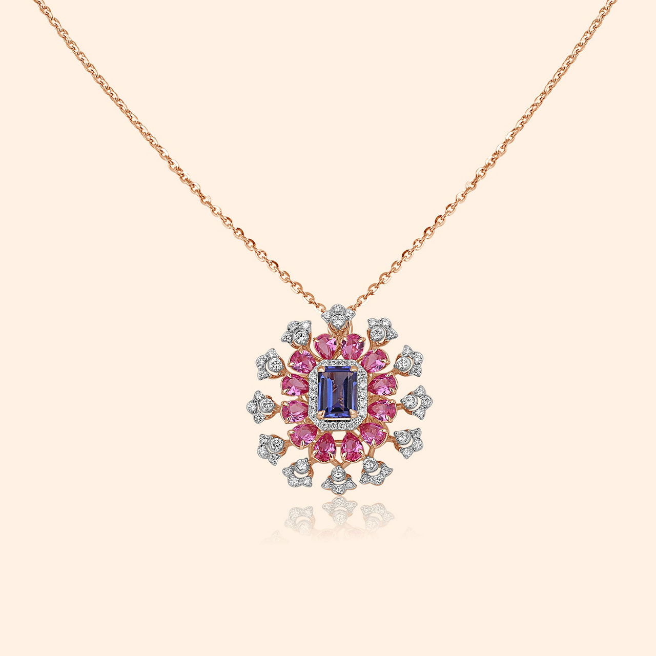 These earrings are a tribute to the delicate beauty of nature. Forged in 18 karat pink gold, they feature radiant round diamonds that mirror the subtle brilliance of morning dew on blooming petals. Accentuated by vibrant gemstone blue and pink stones, these earrings blend modern artistry with timeless floral elegance. With their high shine finish, they are a refined addition to any collection, perfect for a woman who cherishes grace and style in every facet of life.