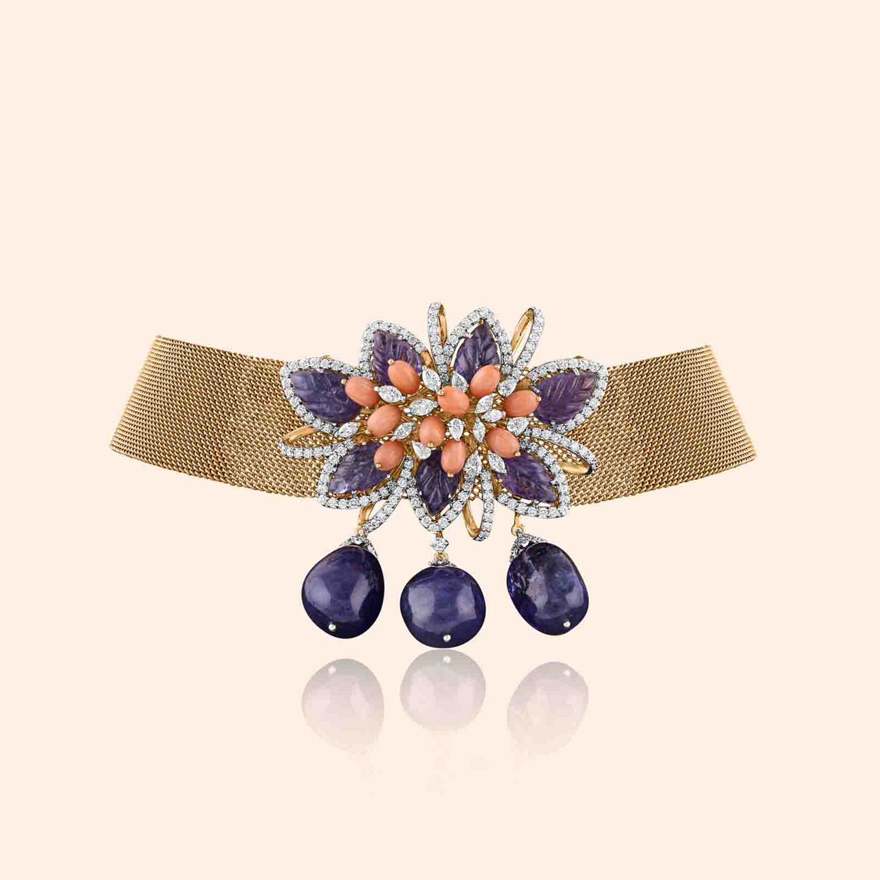 These drop earrings in 18KT yellow gold are inspired by the grace of nature, featuring delicate leaf and floral motifs rendered in an ethno-contemporary style. Adorned with meticulously set diamonds, each element reflects precision and refined craftsmanship. The high-finish enhances the intricacy of the design, creating depth and texture while maintaining elegance. Ideal for heavy occasion wear, the earrings complement traditional and modern ensembles alike, offering a distinguished accessory that embodies sophistication, cultural heritage, and timeless artistry.