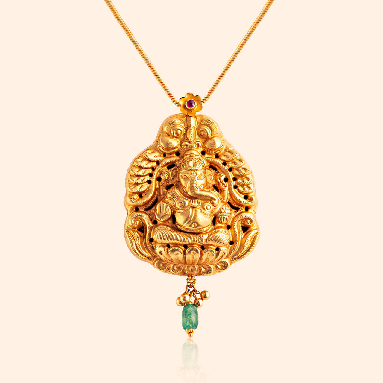 Sacred presence rests upon the ear in sculpted, divine grace, bringing blessings cast in gold from a holy, ancient place. These striking drop earrings showcase meticulously detailed carvings of a revered deity upon pear-shaped studs, rendered with an antique finish that highlights every intricate feature. Dangling below is a serene green stone bead, adding a touch of color and gentle movement. These earrings are powerful symbols of faith and artistry, perfect for devotional wear or special occasions, crafted from venerable 22 karat yellow gold.