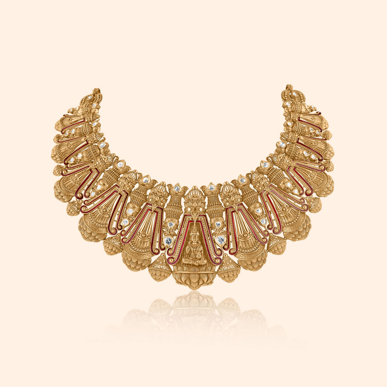 Where ancient whispers meet golden grace, a goddess's blessings, found in this sacred space. These exquisite 22KT yellow gold Drop Earrings, imbued with an antique finish, embody an elevated traditional design. Goddess Lakshmi presides within an intricate ancient pillar pattern, accented by rich crimson enamel details and a radiant clear gemstone at her base. Perfect for light occasion wear, they beautifully complement a flowing chiffon saree or a festive kurta set. Let them be a cherished emblem of heritage and prosperity, gracing your every movement with timeless allure.