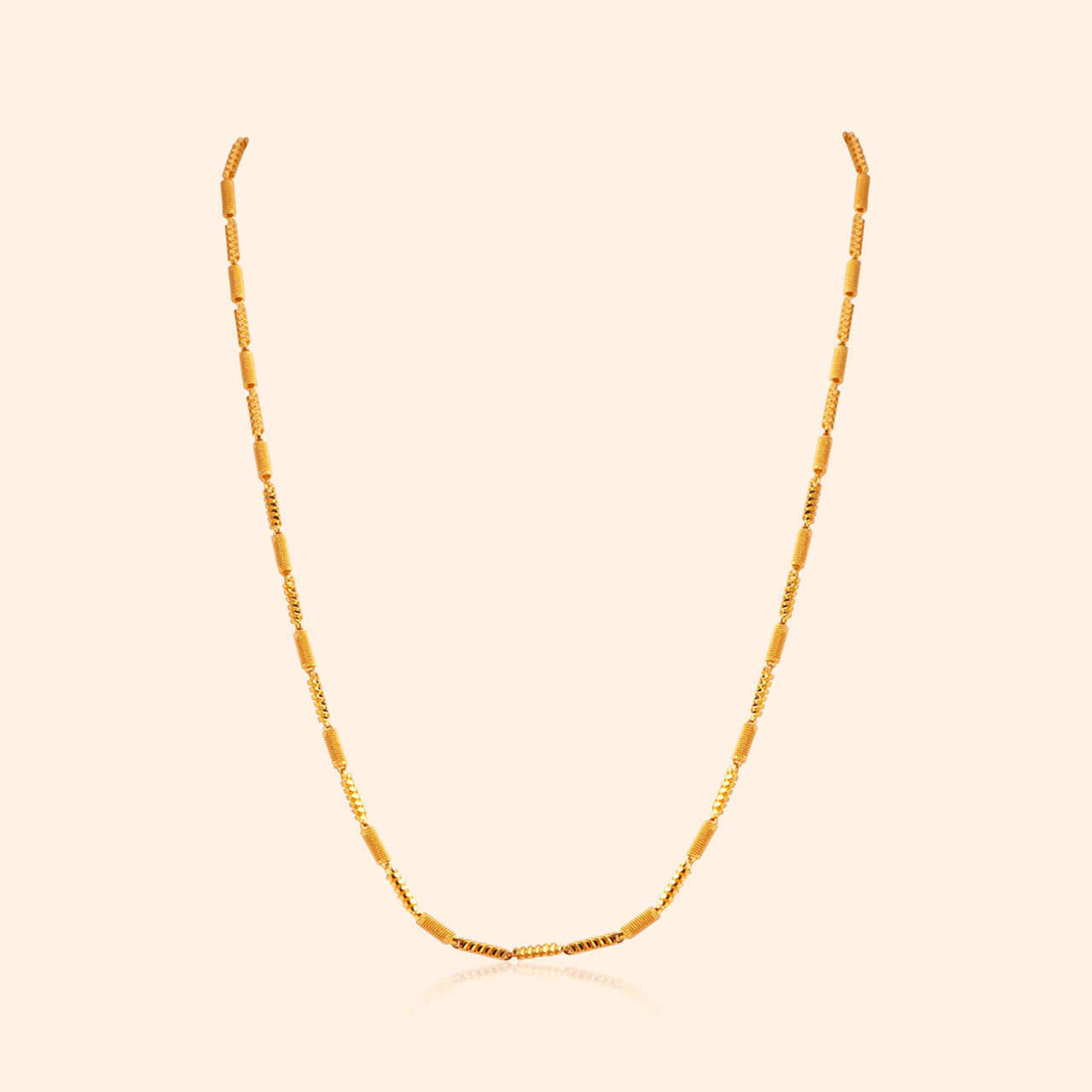 Sparkling beads punctuate a delicate chain, like scattered starlight leading to a unique focal point. This design features a fine chain interspersed with textured and diamond-cut beads in yellow and white gold tones, culminating in a faceted bead pendant with a dangling charm. It offers subtle shimmer and contemporary style, meticulously fashioned from lustrous 22 karat gold.