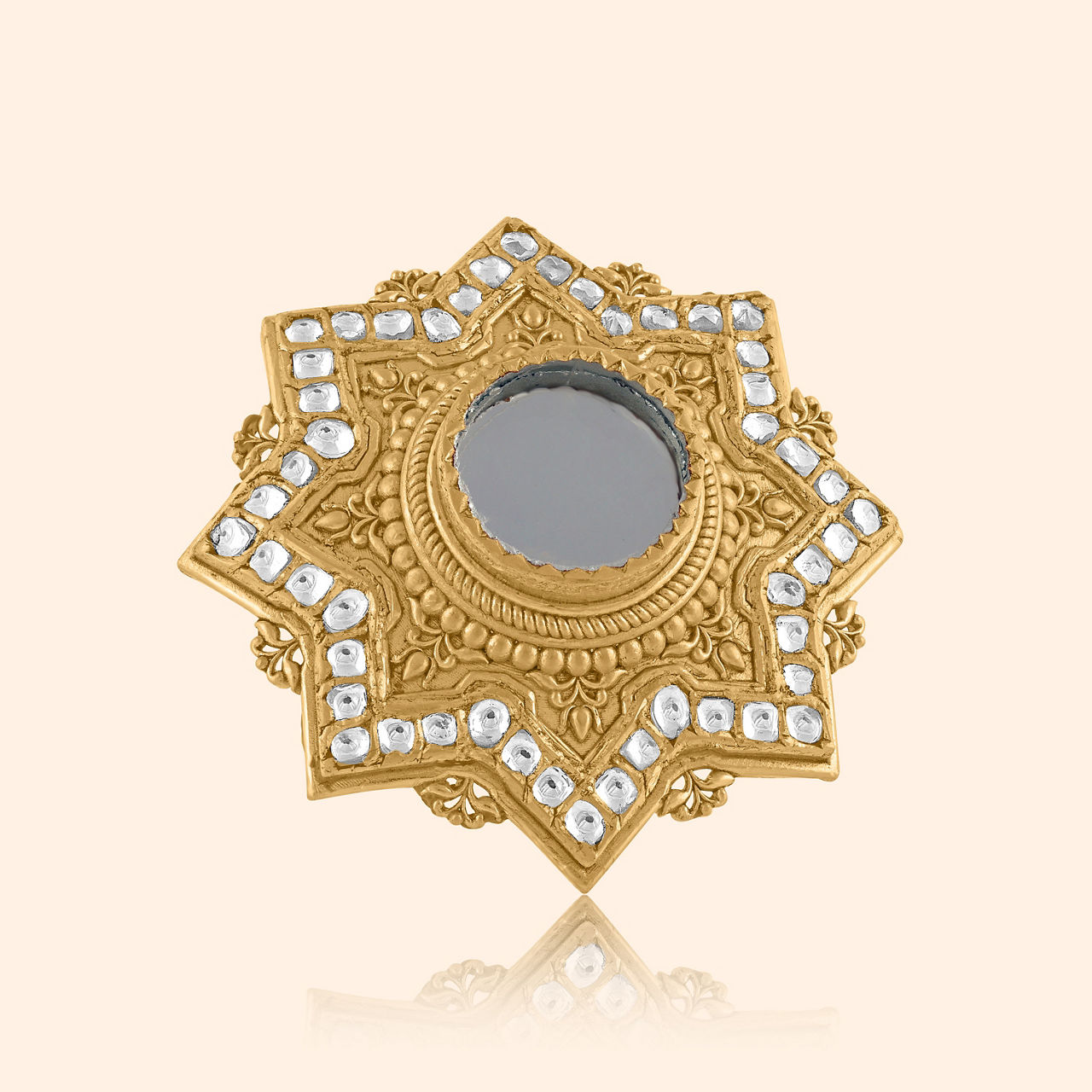 This gold and stone finger ring is a stunning blend of tradition and modern elegance, crafted in 22 karat yellow gold. Featuring a unique geometric design, this ring is adorned with glass polki, gemstones, glass kundan, and pearls, bringing together a beautiful symphony of colors. The standard antique finish enhances its rich appeal, making it the perfect statement piece for any heavy occasion. Whether it's a wedding, celebration, or a grand event, the it adds an exquisite touch of refined beauty.
