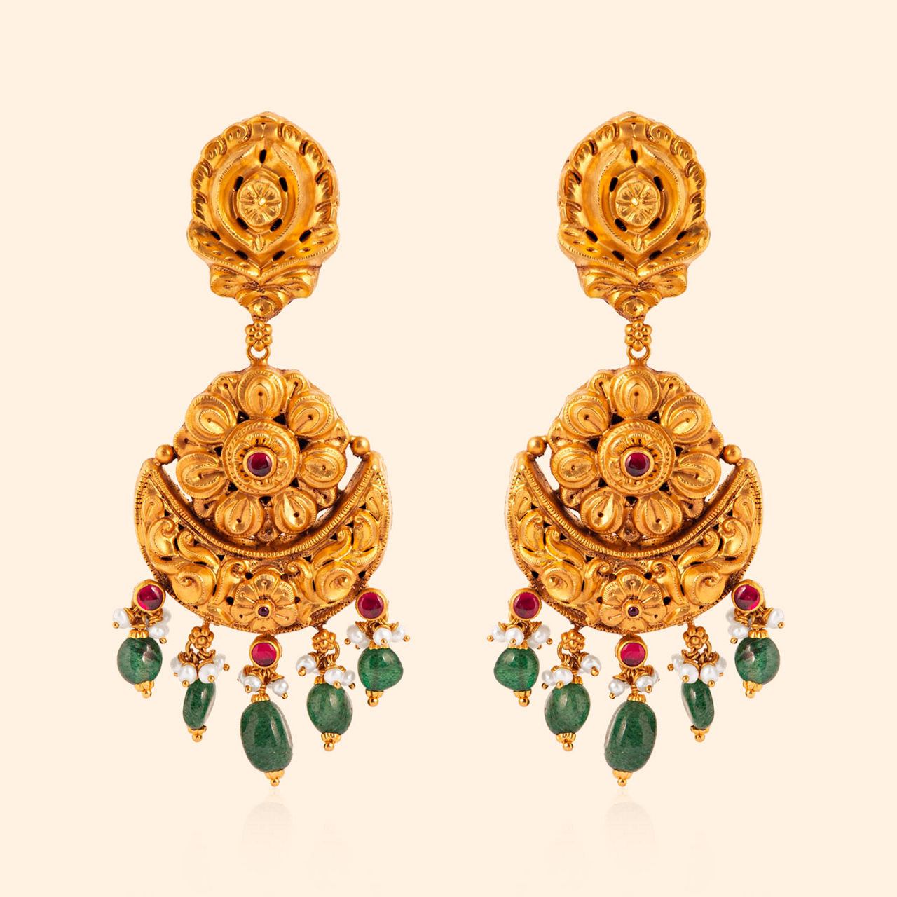 This 22 karat yellow gold long necklace is a tribute to elevated traditional style, adorned with intricate Nakashi craftsmanship. Inspired by the divine essence of Krishna, the jewel radiates a sense of grace and devotion. The necklace features a stunning array of multicoloured stones, including red and green, paired with luminous glass Kundan and pearls. The standard antique finish lends a vintage charm, making it the perfect choice for heavy occasion wear. Handcrafted with care, this necklace balances cultural heritage with contemporary design, making it an ideal accessory to elevate any celebration.