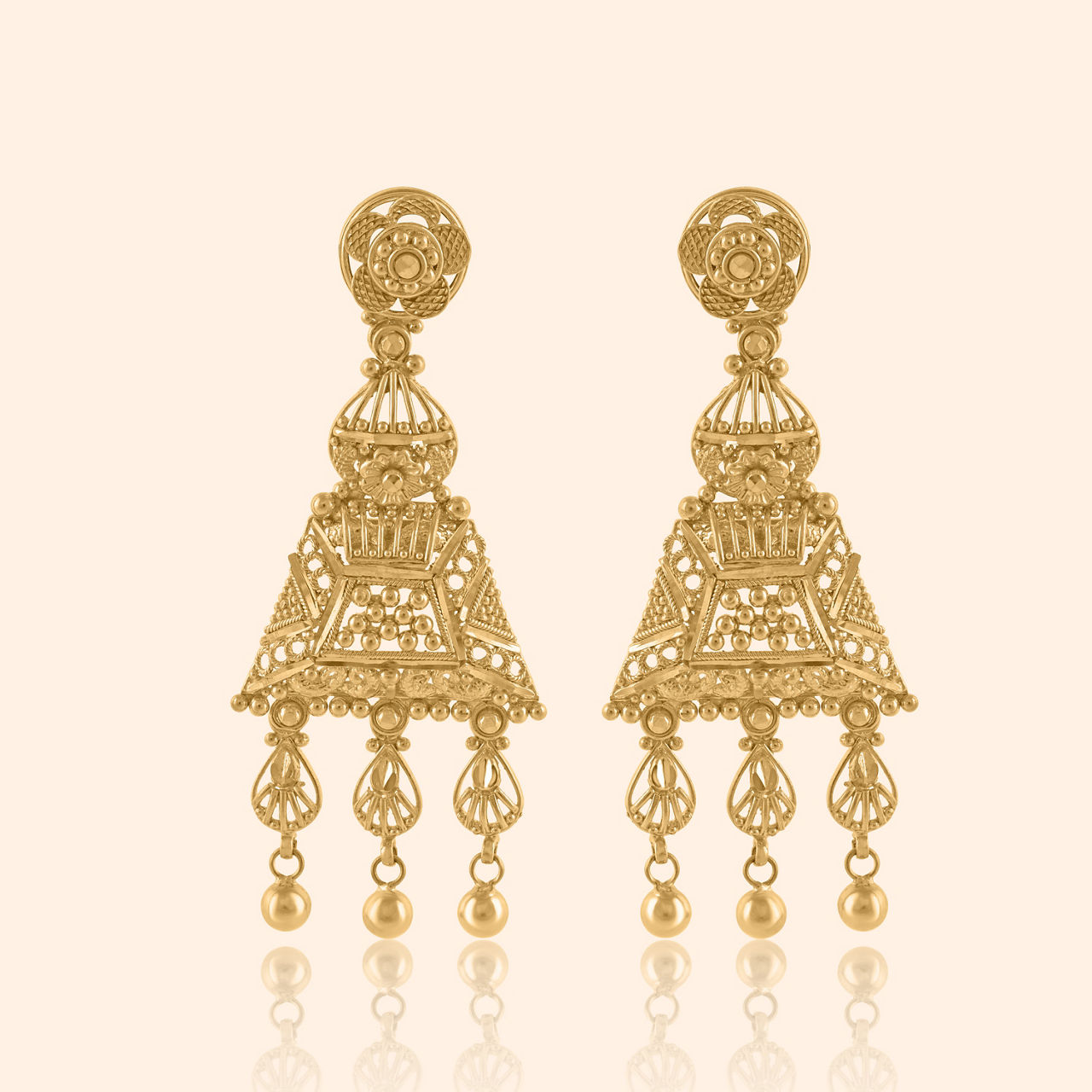 This 22k yellow gold necklace, designed for heavy occasions, features an intricate geometric pattern, meticulously handmade. Its elevated traditional style and substantial presence create a striking piece that blends timeless elegance with modern sophistication.