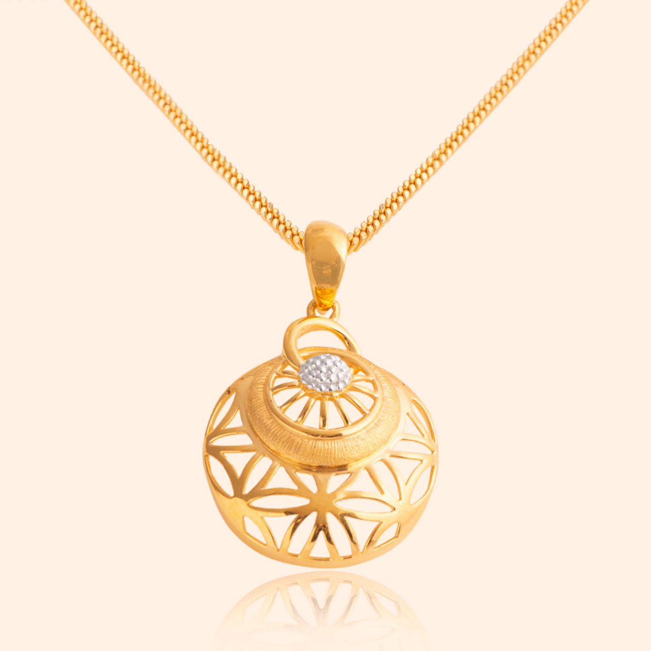 The sun's bright disc holds a dazzling spark, leaving its luminous, textured mark, piercing through shadows of the dark. These striking stud earrings feature a central textured element reminiscent of a diamond cluster, set within a circular frame adorned with intricate openwork that creates a web of light and shadow. They blend modern geometry with traditional texture. Crafted with a two-tone effect in rich 22 karat yellow gold, they offer contemporary yet timeless appeal, suitable for elevating everyday looks with a touch of refined brilliance.